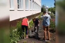 Хезмәт лагере укучылары мәктәп яны участогы территориясен бик тырышып төзекләндерәләр.