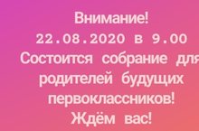 В субботу 22 августа в 9.00 состоится собрание для родителей будущих первоклассников.Приглашаем всех желающих родителей!