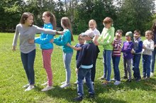 Ял һәм хезмәт лагеренә йөрүче балалар түтәлләрне утыйлар.