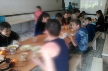 Ял һәм хезмәт лагерендә эшләүче укучылар тырышып эшлиләр, ял итәләр, ашарга да күмәкләп керәләр.