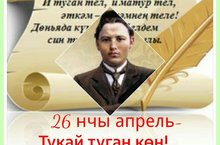 Тукай туган көн 26.04.2017 Бүген без бөек шагыйребез Габдулла Тукай туган көнне билгеләп үтәбез. Моннан 131 ел элек, 1886 нчы елның 26 нчы апрелендә дөньяга килеп, 104 ел элек, ягъни 1913 нче елның 3 нче апрель иртәсендә дөньядан китеп тә барган Тукай бүген дә безнең арабызда кебек. Аның иҗаты, аның геройлары безнең күңелләрдә, безнең җаныбызда.
