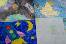 Среди учащихся начальных классов прошёл конкурс рисунков "День космонавтики". Из лучших работ учащихся сделали выставку рисунков и повесили в фое нашей школы.