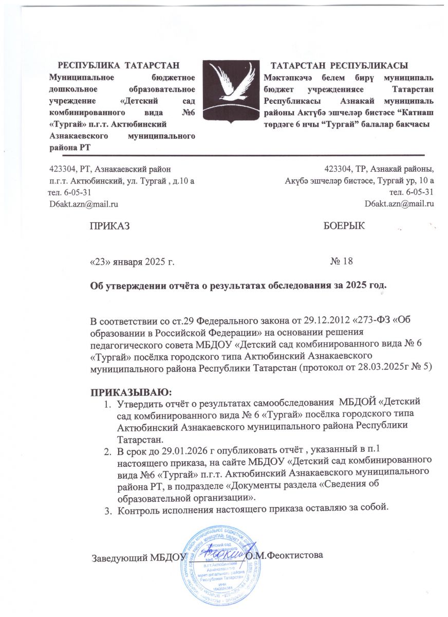 Муниципальное бюджетное дошкольное образовательное учреждение «Детский сад комбинированного вида №6 «Тургай» поселка городского типа Актюбинский Азнакаевского муниципального района Республики Татарстан