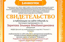 Свидетельство о публикации на сайте infourok.ru Настоящим подтверждаеться, что Зарипова Эльвира Мисбахетдиновна заведующий МБДОУ№12 опубликовала методическую разработку "Разработка образовательной деятельности для старшего возраста" 26.04.2019
