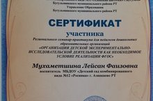 Участие педагога Мухаметшина Л.Ф. в региональном семинаре для педагогов ДОУ г. Бугульма."Организация детской экспериментально - исследовательской деятельности как необходимое условие реализации ФГОС". 28.03.2018