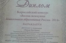 Дипломом за Всероссийский конкурс "Восемь жемчужин" дошкольного образования России 2014" награждается Дипломант в номинации "Первая Виктория" Зарипова Э.М, Давлетшина А.Ф, Хазиева Г.З, Шакирзянова Р.М, Якупова Р.Г МБДОУ "Детский сад комбинированного вида №12 "Росинка" г.Азнакаево РТ 08.12.2015