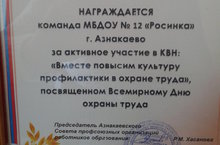 Награждается команда МБДОУ №12 "Росинка" г. Азнакаево за активное участие в КВН: "Вместе повысим культуру профилактики в охране труда, посвященном Всемирному Дню охраны труда". 24.04.2015