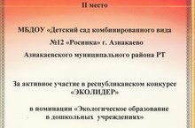 Грамота II место за активное участие в республиканском конкурсе "Эколидер" в номинации "Экологическое образование в дошкольных учреждениях" 05.05.2015