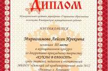Дипломом награждается воспитатель Миргалимова Лейсан Ирековна занявшая 3 место в муниципальном конкурсе "Куклы в радость" 24.02.2015