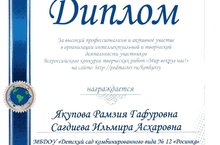 ДИПЛОМ ООО "Центр дистанционного сотрудничества" "Педагогическое мастерство". Всероссийского конкурса творческих работ "Мир вокруг нас!" Награждаются воспитатели: Якупова Р.Г., Сагдиева И.А.. 20.11.2014