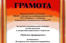 Грамота педагогическому коллективу за участие в муниципальном конкурсе детских рисунков и декоративно-прикладного творчества "Чудесное превращение", посвященного Всемирному дню вторичной переработки 27.11.2014