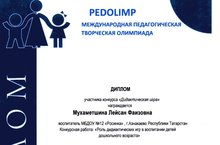 PEDOLIMP Международная педагогическая олимпиада. Дипломом участника награждена Мухаметшина Лейсан Фаизовна за конкурсную работу "Роль дидактических игр в воспитании детей дошкольного возраста" 11.12.2014