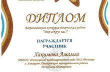 ДИПЛОМ ООО "Центр дистанционного сотрудничества" "Педагогическое мастерство". Всероссийского конкурса творческих работ "Мир вокруг нас!" Награждается воспитанница Хакимова Амалия 12.12.2014