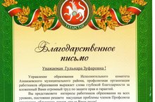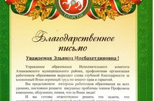 Благодарственное письмо Зариповой Эльвире Мисбахетдинове заведующей детского сада от Управления образования исполнительного комитета Азнакаевского муниципального района, профсоюзная организация работников образования выражает слова благодарности за вложенный огромный труд по защите прав и гарантий. 26.09.2014