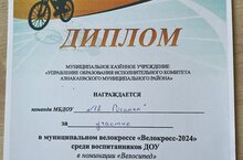 Диплом награждаются воспитанники ДОУ в муниципальном "Велокроссе 2024" 02.10.2024