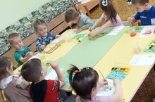 Цель: учить создавать аппликативные изображения овощей: морковку – способом разрезания прямоугольника по диагонали и закругления углов, капусту – способом обрывной и накладной аппликации. Во время занятия дети учились дружному взаимодействию коллективной работы.Урта төркемдә "Куян бакчасы "дигән темага аппликация шөгыле уздырылды. Максат: балаларга яшелчәләрнең сурәтләрен кисеп-ябыштырырга өйрәтү: кишерне – турыпочмаклыкны диагональ буенча кисү, кәбестәне – өзек-өзек кисеп- ябыштыру ысулы белән ясау. Дәрес вакытында балалар бик теләп күмәк эшне бердәм башкардылар.