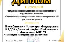 ДИПЛОМ II степени Республиканского конкурса профессионального мастерства педагогических работников "Современные практики реализации опытно - экспериментальнойдеятельности с детьми " награждается воспитатель Насибуллина Ильмира Ильдаровна. Номинации: "Методическая разработка". 15.04.2024