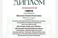 Диплом победителя 1 место награждается Шаехова Рания Расилевна. в номинации "Литературное наследие" Руководители Набиллина Ильмира Ильдаровна - воспитатель, Мухамадиева Светлана Радимовна - воспитатель. 19.04.2024