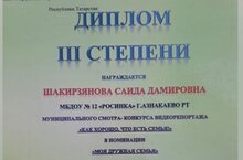 Диплом III степени награждается Шакирзянова Саида Дамировна смотра конкурса видеорепортажа "Как хорошо, что есть семья" 21.03.2024