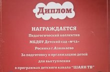 ДИПЛОМ Награждается педагогический коллектив за подготовку и организацию детей для выступления в программах детского канала "Шаян ТВ" 15.01.2021