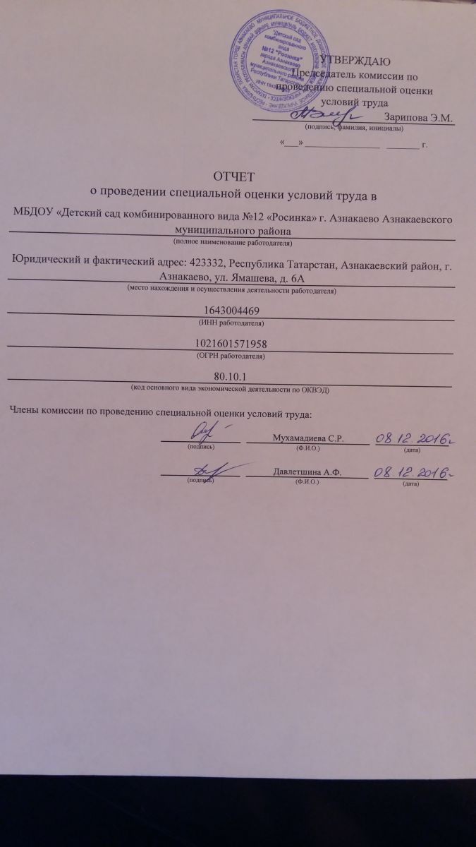Отчет о проведении сециальной оценки условий труда по МБДОУ№12