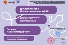 Ученик 9Б класса Латыпов Нариман (учитель Ахметова Л.Х.) стал призером Осенних олимпиад Winkid по русскому языку ФГАОУ ВО "Казанский (Приволжский) федеральный университет".