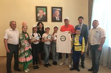 Делегация школы во главе с директором Хамидуллиным Г.М. побывала на приеме у Марселя Зуфаровича и преподнесла сувениры с символикой акции «Мин татарча сойлэшэм». -