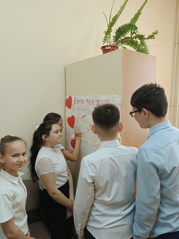 В нашей школе началась неделя психологии. Педагог- психолог Хафизова Е.Ф. провела с учениками забор психологической разгрузки и снятия напряжения, ученики писали пожелания друг другу.