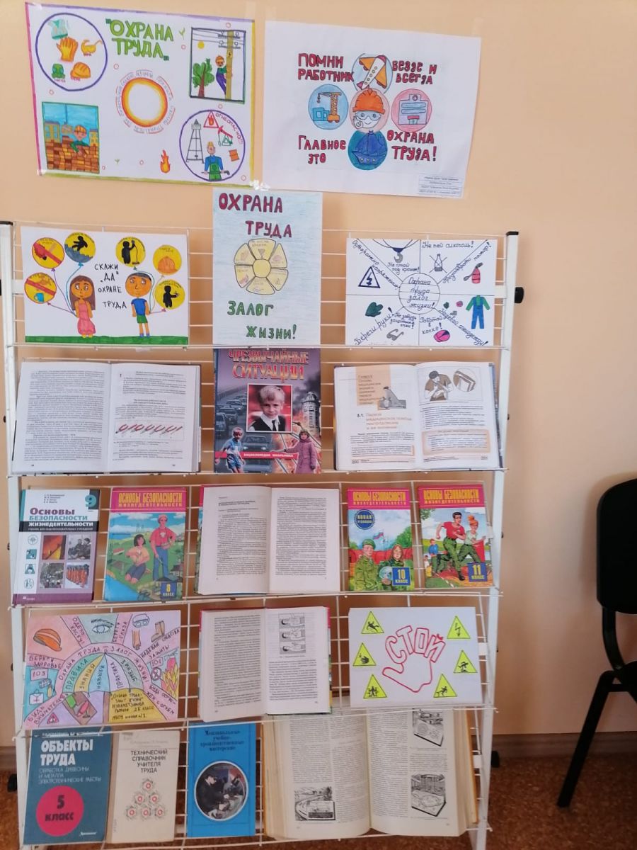 Хезмәтне саклау айлыгы кысаларында китап күргәзмәсе оештырылды. Китап күргәзмәсе янында укучылар хезмәткәрләрнең хокукларын яклау һәм гарантияләү, хезмәтне саклау өлкәсендә контроль мәсьәләләре белән таныштылар. Укучылар игътибарына хезмәт законнары (РФ Хезмәт кодексы), кагыйдәләр, хезмәтне саклау һәм куркынычсызлык буенча инструкцияләр), уку әдәбияты (хезмәт хокукы, хезмәтне саклау, Тормыш иминлеге нигезләре буенча дәреслекләр) материаллары тәкъдим ителде. Тәкъдим ителгән материалларның төп эчтәлеге аңлату һәм мәгълүмат бирүгә, куркынычсыз хезмәтне оештыру күнекмәләрен формалаштыруга юнәлдерелгән.