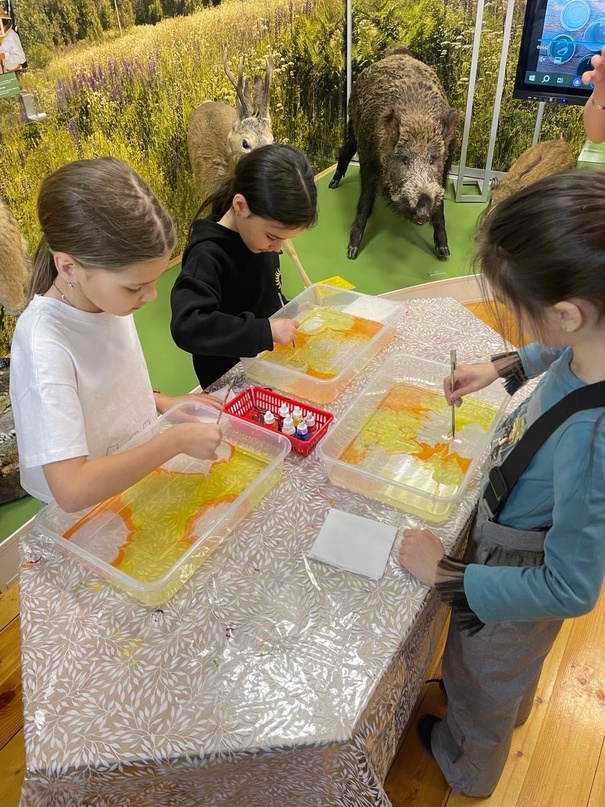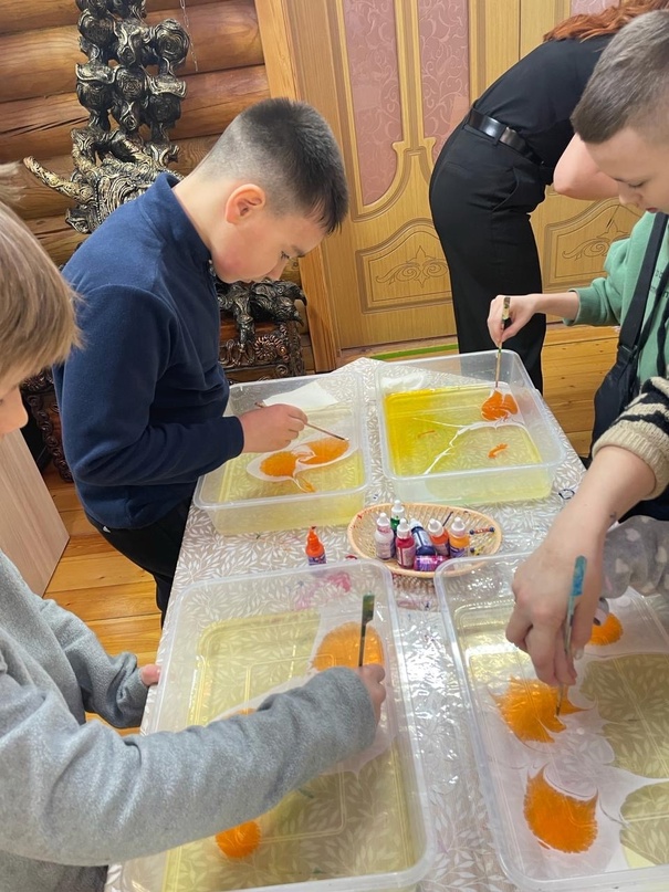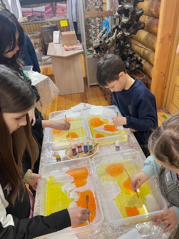На каникулах учащиеся кружка «Почемучки» посетили мастер - класс по технике рисования Эбру в краеведческом музее