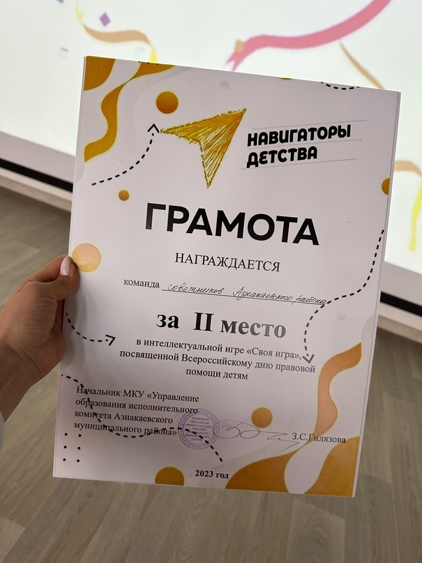 2023 елның 22 ноябрендә Азнакай шәһәрендә Бөтенроссия хокукый ярдәм көненә багышланган «Үзеңнең уен» интеллектуаль уены узды. Уенда Азнакай, Баулы, Ютазы районнарының балалар иҗтимагый берләшмәләре белән тәрбия һәм хезмәттәшлек буенча киңәшчеләр командалары катнашты. Безнең мәктәпне тәрбия буенча директор киңәшчесе Р. Р. Нагайбекова тәкъдим итте.