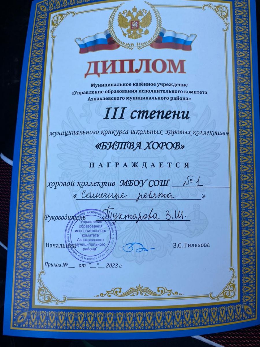 Поздравляем хоровой коллектив "Солнечные ребята" с призовым местом на муниципальном конкурсе школьных хоровых коллективов "Битва хоров" и выражаем благодарность руководтителю коллектива Туктаровой З.Ш. за плодотворный труд и профессионализм, за большой вклад в развитие культуры. Желаем каждому неиссякаемой энергии, творческого успеха и процветания!