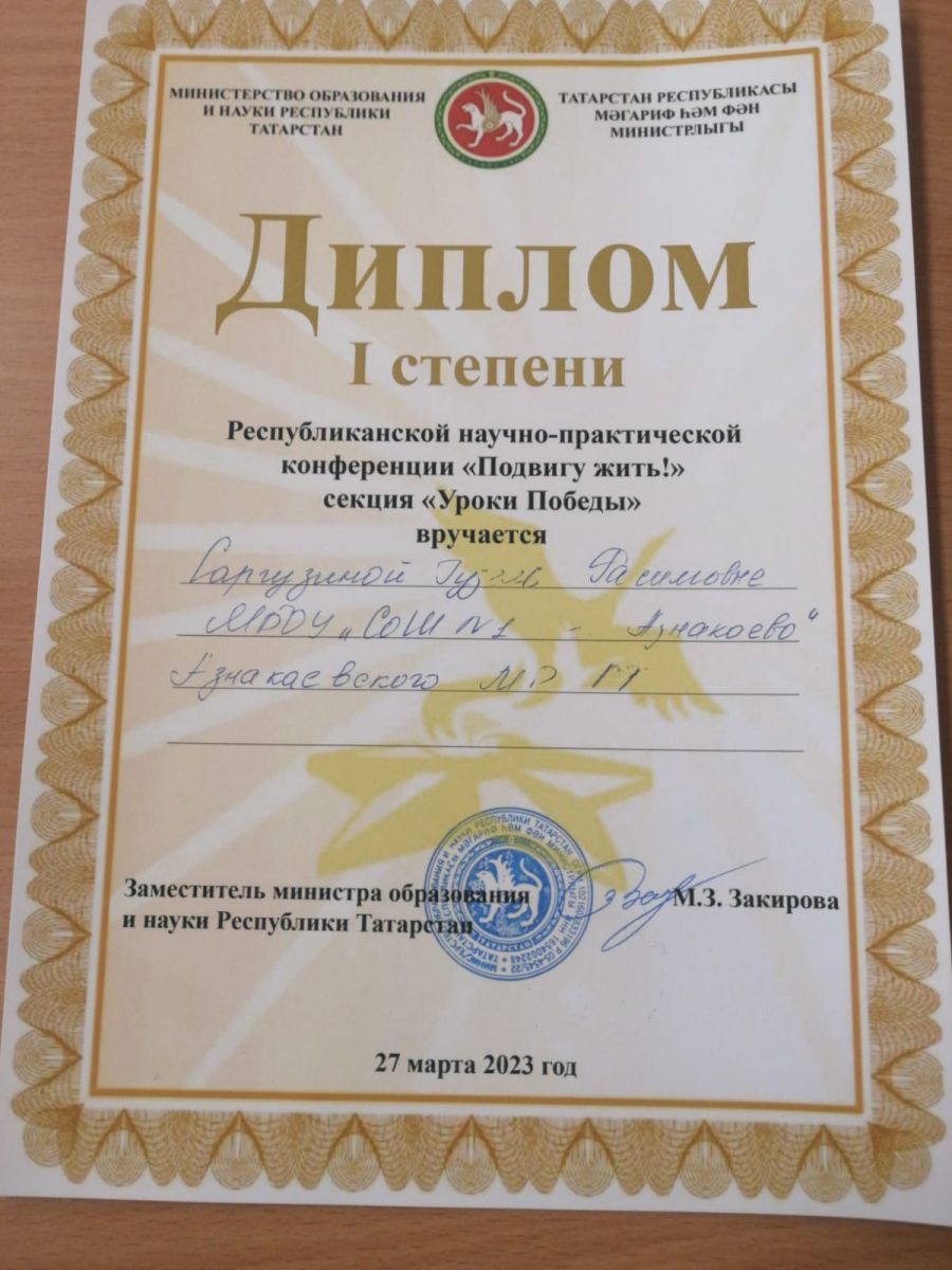 28 марта учитель татарского языка и литературы Саргузина Г.Р. приняла участие и стала обладателем диплома I степени на заключительном этапе Республиканской научно-практической конференции «Подвигу жить!» (секция «Уроки Победы»), которая проходила в Набережных Челнах на базе кадетской школы №82 имени Героя Советского Союза Ильдара Маннанова. От всей души поздравляем педагога с признанием и победой, желаем дальнейших успехов! Оставайтесь такой же активной и целеустремленной!
