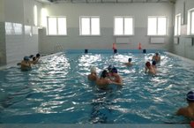 В школьном бассейне проходят занятия по плаванию в рамках уроков физической культуры.
