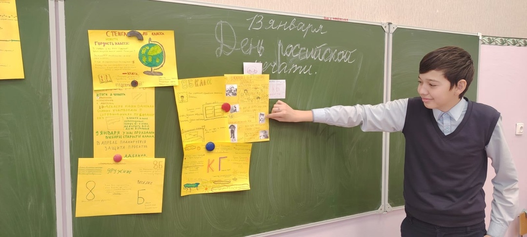 Бүген дәрестән тыш эшчәнлек кысаларында "Россия матбугаты көне"темасына дәрес узды.8 Б сыйныфы укучылары үз классларының стена газеталары макетларын төзеп, үзләрен редакторлар, корректорлар һәм дизайнерлар образында сынап карадылар.