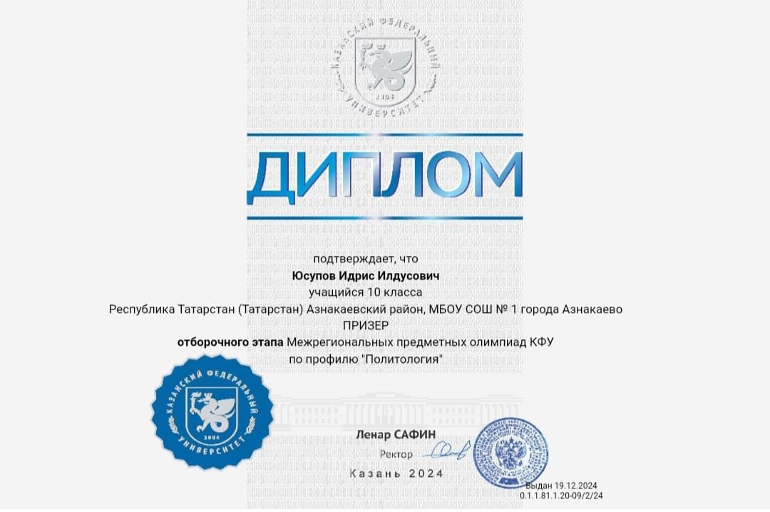 Поздравляем призёров Юсупова Идриса, Гарипову Гузель, Гарифуллину Камилу(учащиеся 10 класса) отборочного этапа Межрегиональной предметной олимпиады КФУ по обществознанию и политологии! Молодцы, ребята! Удачи на заключительном этапе!
