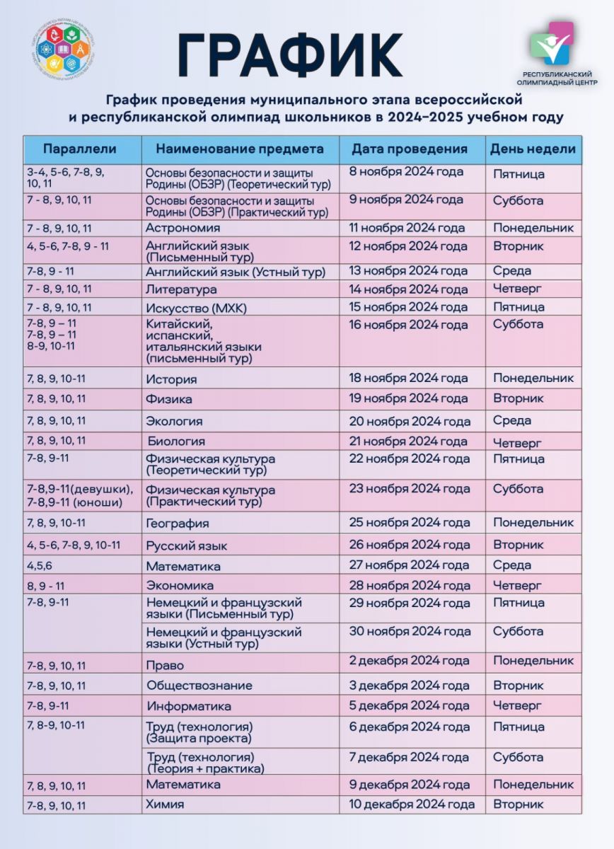 С 8 ноября 2024 года стартует муниципальный этап республиканской и всероссийской олимпиад школьников! Кто может участвовать:участники школьного этапа в этом году, набравшие проходные баллы; победители и призеры муниципального этапа прошлого года. Важно отметить, что школьники могут участвовать в олимпиадах по русскому, английскому, родному (татарскому) языкам и математике уже с 4 класса, а по основам безопасности и защиты Родины — с 3 класса.Муниципальный этап олимпиады завершится 20 декабря.