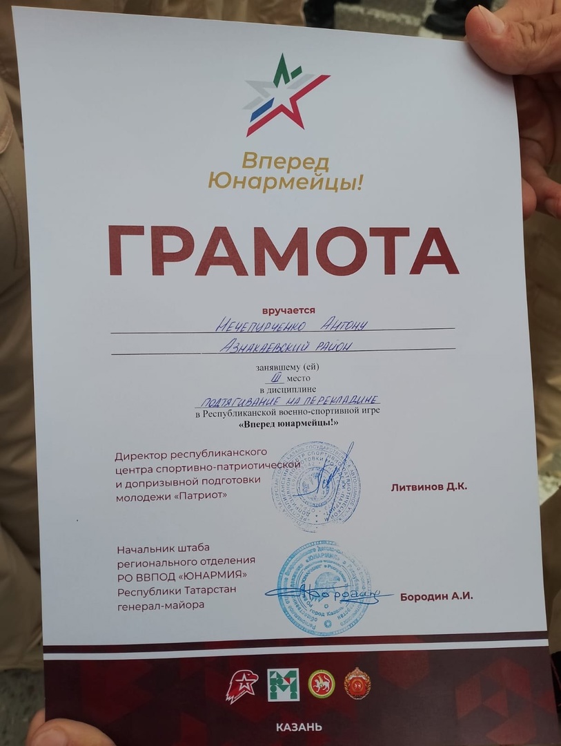 На базе центра допризывной подготовки «Патриот» в г. Казани прошел зональный этап республиканской военно-спортивной игры «Вперед, юнармейцы!». Это событие собрало лучшие команды юнармейцев со всего региона, и команда МБОУ "СОШ N 1 г. Азнакаево" РТ не осталась в стороне.Ребята столкнулись с множеством испытаний, включая теоретический конкурс, соревнования по строевой подготовке, бег на 60 метров, наклоны туловища, подтягивание на перекладине, а также огневой рубеж и военно-тактическую игру. Несмотря на ограниченное время на подготовку, юнармейцы проявили невероятный командный дух и сплоченность.В личном зачёте ученик 10 класса Нечепуренко Антон занял 3 место в дисциплине "Подтягивание на перекладине".Это достижение стало результатом упорного труда и настойчивости самих ребят и руководителя команды Усманова А.Ш.