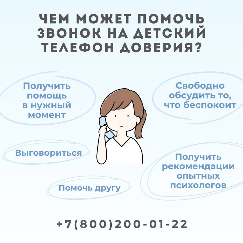 Детский телефон доверия создан для оказания психологической помощи детям, подросткам и их родителям в трудных жизненных ситуациях. На обратной линии вас всегда готовы выслушать, поддержать и дать совет.