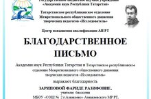 Благодарственное письмо Академии наук РТ члену экспертного совета регионального этапа Всероссийского конкурса исследовательских работ учащихся 5-7 классов "Тропой открытий В.И.Вернандского" (учитель биологии Зарипова Ф.Р.) 18.02.2023