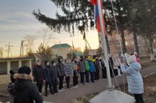 Традиционное чествование государственных симоволов Российской Федерации и Республики Татарстан-поднятие флагов и исполнение гимна в начальной школе.
