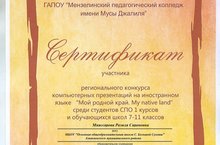 Поздравляем ученицу 9 класса Мияссарову Разилю и учителя английского языка Гараеву Р.Ф. с блестательным творческим проектом в рамках Регионального конкурса компьютерных презентаций на иностранном языке «Мой родной край. My native land », организованный «Мензелинским педагогическим колледжом имени Мусы Джалиля»! Так держать!