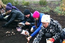Бүген мәктәп укучылары, укытучылар һәм тех. эшчеләр Бөек Җиңүнең 70 еллыгына багышлап 70 төп тюльпан чэчэкләре утыртуда катнаштылар
