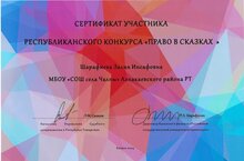 Шарафиева Залия получила сертификат Республиканского конкурса "Право в сказках". Руководитель- учитель истории Ракипова Рамиля Равиловна.Молодец! Поздравляем!