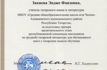 Наша учительница родного (татарского) языка и литературы Закиева Эндже Фаизовна награждена Грамотой Министерства образования и науки Республики Татарстан "За подготовку призера заключительного этапа республиканской олимпиады школьников по родной (татарской) литературе для обучающихся школ с татарским языком обучения. Поздравляем!
