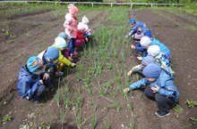 Дети средней группы посадили лук. Вот взошли их саженцы. Дети знают, чтобы лук хорошо рос нужно полоть сорняки.