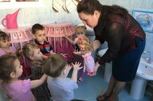 Дети первой младшей группы учат куклу мыть руки.