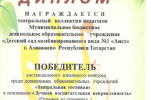 Коллектив детского сада принял участие в зональном конкурсе "Театральная гостиная" и удостоился диплома победителя.