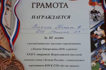 Награждается Вахнина Т.Н. за 3 место в республиканских массовых соревнованиях "Лыжня Татарстана - 2018" в рамках XXXVI открытой Всероссийской массовой лыжной гонки "Лыжня России" с выполнением нормативов ВФСК ГТО "бег на лыжах" . 14.02.2018