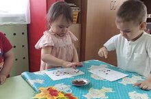 В первой младшей группе №4 (воспитатель Хафизова Ф.А.) нетрадиционное рисование с использованием пальчиков "Орешки для белочки".